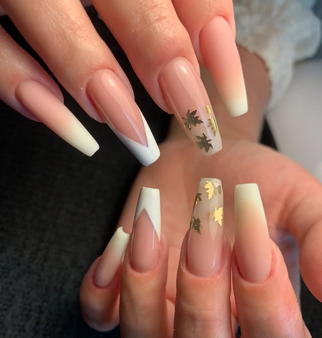 Ballerina nails have long been the go-to shape for those who crave a balance of elegance and edge. With their signature tapered sides and squared-off tips, they elongate the fingers, creating a refined and graceful silhouette reminiscent of a ballerina’s pointe shoes. This stunning manicure captures that sophistication beautifully, blending soft, neutral tones with a touch of seasonal charm.The base of this design is a flawless blush nude, giving the nails a clean, polished canvas that complements every skin tone. From there, a soft ombré effect transitions into creamy white tips, offering a modern spin on the classic French manicure. The subtle gradient is dreamy yet minimalist, creating a manicure that feels fresh, versatile, and high-end.Two statement nails elevate the look with delicate golden maple leaf accents, perfectly encapsulating the essence of autumn. These metallic details catch the light like jewelry, adding depth and richness to the overall aesthetic. The placement of the foil leaves feels intentional and artistic, as if each nail is its own mini masterpiece.