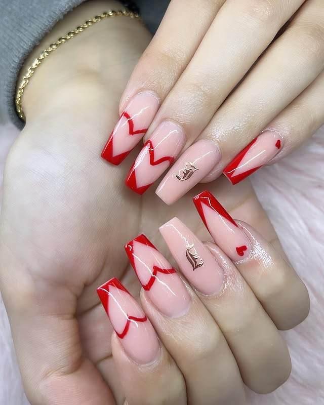 There’s nothing quite like a red manicure to make a bold statement, and this set of ballerina nails elevates that timeless allure to a whole new level. With their elegant yet edgy silhouette, ballerina nails — also known as coffin nails — create a sleek, elongated effect that makes every gesture feel more refined and confident. They’re the perfect blank canvas for intricate designs, and this fiery red masterpiece proves exactly why.This design reimagines the classic French tip with a daring twist. Instead of a simple curved edge, the tips are painted in a vibrant, high-gloss crimson that creates sharp, heart-inspired angles and playful geometric lines. The vivid red pops beautifully against a soft nude base, striking the perfect balance between daring and delicate. On select nails, minimalist red hearts and chic metallic decals add a luxe, romantic touch, making this set feel like a piece of couture art.The glossy finish enhances the color contrast, giving these nails a “glass-like” glow that catches the light at every turn. The ballerina shape, with its tapered sides and squared-off tips, only adds to the drama — elongating the fingers and making them look like they were designed for a jewelry ad campaign. This is the kind of manicure that doesn’t just complement your outfit; it defines it.