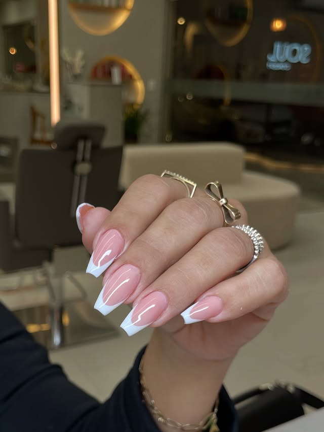 There’s something undeniably captivating about a classic French manicure — and when paired with the graceful ballerina nail shape, it becomes an instant icon. These nails are more than just a beauty statement; they’re a symbol of sophistication, femininity, and effortless style. With their slender sides and squared tips, ballerina nails elongate the fingers and give your hands that chic, editorial finish seen on runways and Pinterest boards alike.In this look, the soft blush-pink base creates a delicate, barely-there backdrop, while the crisp white tips form a striking contrast. The clean lines of the French design follow the elegant curve of the nail, making it feel timeless yet modern. It’s a design that whispers refinement — polished enough for a gala night but simple enough for everyday wear.What makes this set feel so fresh is its glass-like shine. The glossy top coat reflects light beautifully, giving your nails a “wet look” effect that elevates the entire manicure. The ballerina shape, sometimes called “coffin nails,” adds just the right edge, transforming a classic French into a contemporary fashion statement.
