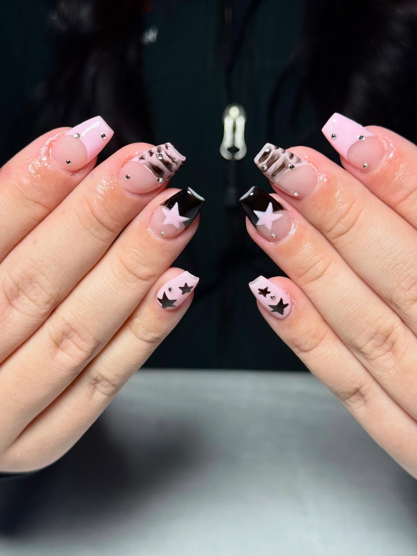 This design embraces a dreamy celestial theme, blending delicate soft pinks with bold, graphic black elements. The nails alternate between a glossy pastel pink base adorned with tiny metallic studs and striking designs that feature stars, moons, and a bold black-and-pink contrast. The interplay of colors is both modern and whimsical, offering that perfect Pinterest-worthy vibe.Adding a twist of high-fashion artistry, some nails feature a unique marble effect, giving them a sense of texture and depth that elevates the entire manicure. The star accents create a playful cosmic vibe, while the soft pink tones keep it feminine and wearable. It’s a design that effortlessly transitions from a chic daytime look to a glamorous evening aesthetic, making it versatile for any occasion.