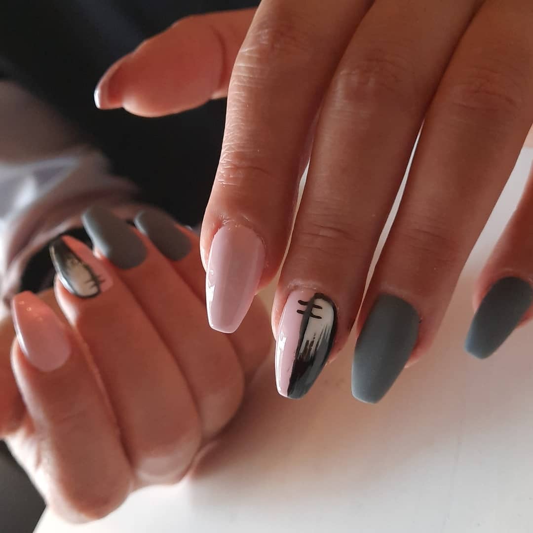 What makes this design even more unique is the artistic accent nail. With brushstroke-inspired black detailing over a nude base, it adds just the right amount of creativity to the overall look. Instead of overwhelming the manicure, the design feels subtle yet eye-catching, elevating the simple shades of pink and grey into something fashion-forward.