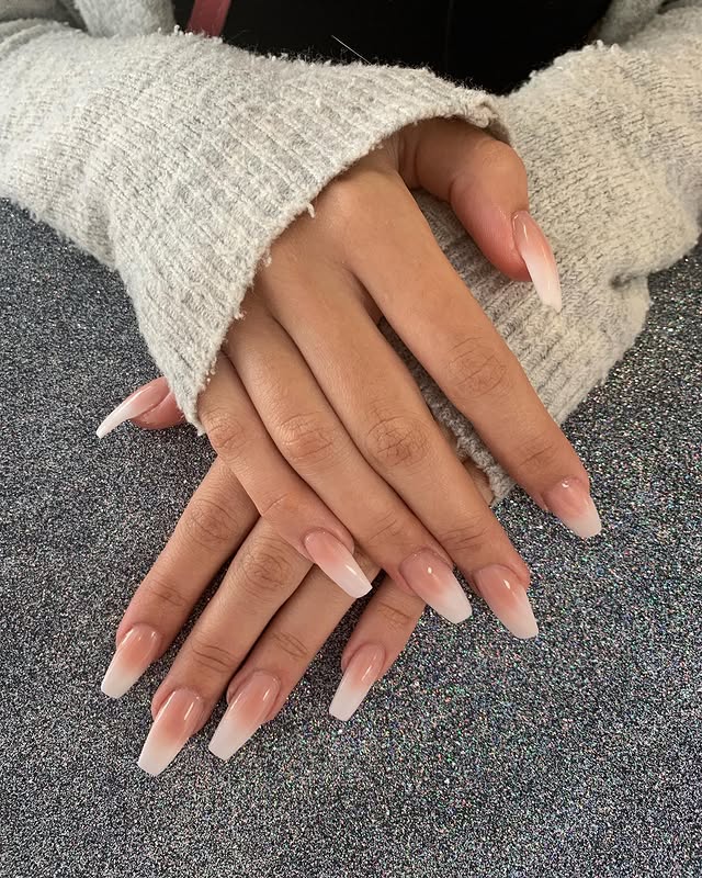 There’s something undeniably timeless about classic ballerina nails, and this design is the perfect example of elegance meeting simplicity. With their sleek, tapered shape and squared-off tips, ballerina nails naturally give off a chic and polished vibe. The soft pink base that gently fades into a crisp white tip creates a dreamy ombré effect, making this manicure look delicate, feminine, and effortlessly stylish.This design works beautifully for anyone who loves understated sophistication. The natural tones ensure that the nails complement any outfit, whether it’s casual everyday wear or a formal evening look. Unlike bold colors or heavy patterns, the soft pink-to-white gradient feels fresh and versatile, allowing it to be worn in every season. It’s the kind of manicure that never goes out of style, making it a perfect choice for those who prefer timeless beauty over fleeting trends.
