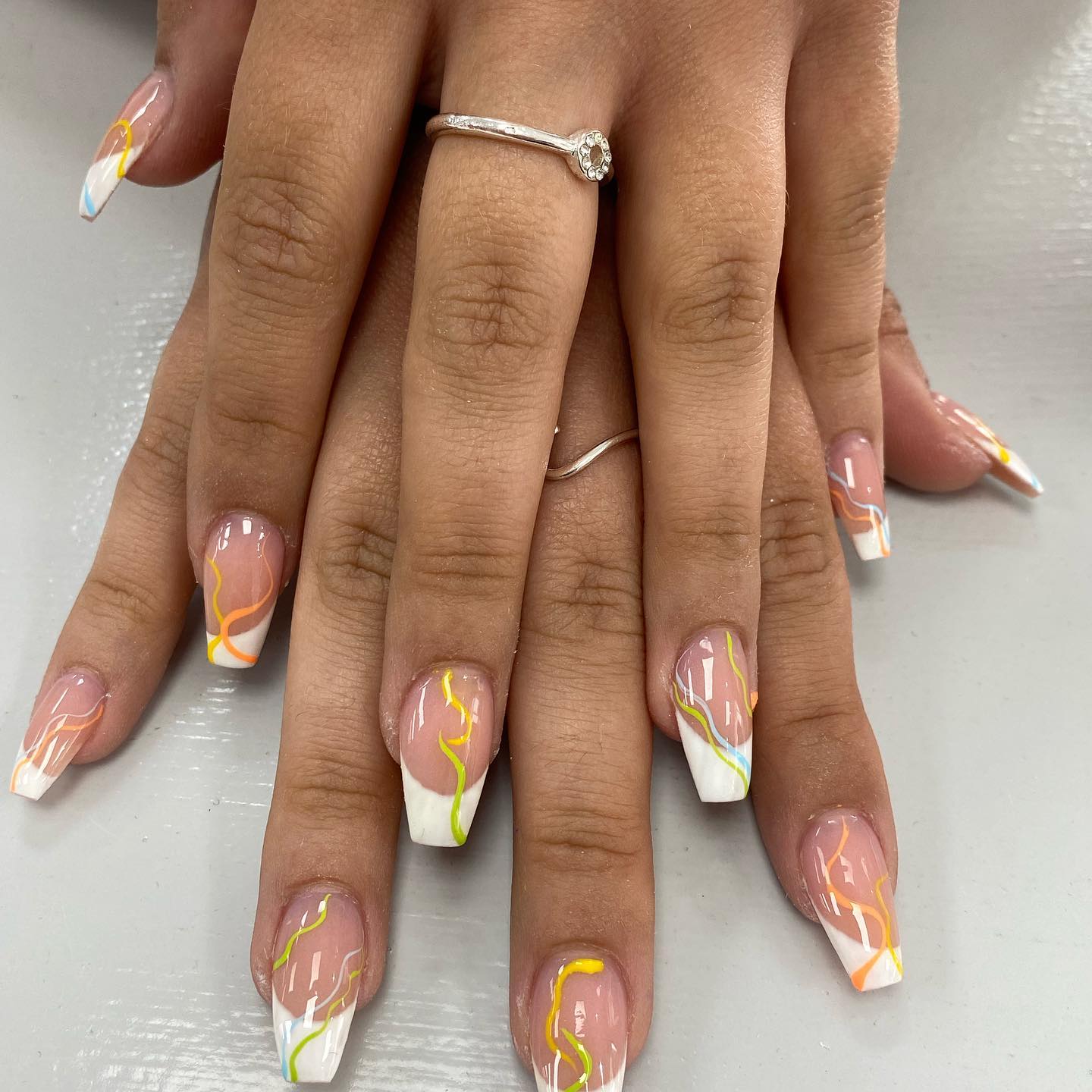 In this set, the artistry begins with a glossy nude base that exudes effortless elegance. Over this soft, neutral background, white tips form a contemporary take on the French manicure, their angular edges emphasizing the bold ballerina silhouette. But what truly makes this nail design captivating are the vibrant abstract lines that dance across each nail in shades of sunshine yellow, citrus orange, lively lime, and sky blue. These playful streaks add a refreshing burst of color, reminiscent of summer sunsets and tropical vibes, making this design a perfect accessory for sunny days or vacation getaways.The combination of clean white tips and lively abstract accents gives this manicure a modern-art feel. It’s chic yet playful, minimal yet bursting with personality. This design strikes a balance between elegance and creativity, making it a versatile choice for fashion lovers who want their nails to stand out without being overpowering.Ballerina nails are known for their refined, elongated shape that mimics a pointe shoe, making them a favorite for anyone looking to add an instant dose of glamour. This design elevates that sophistication with a contemporary twist, transforming your nails into tiny, wearable canvases. Whether you’re strolling through a beach town in flowy dresses or heading to a rooftop brunch with friends, this nail look effortlessly complements every aesthetic.