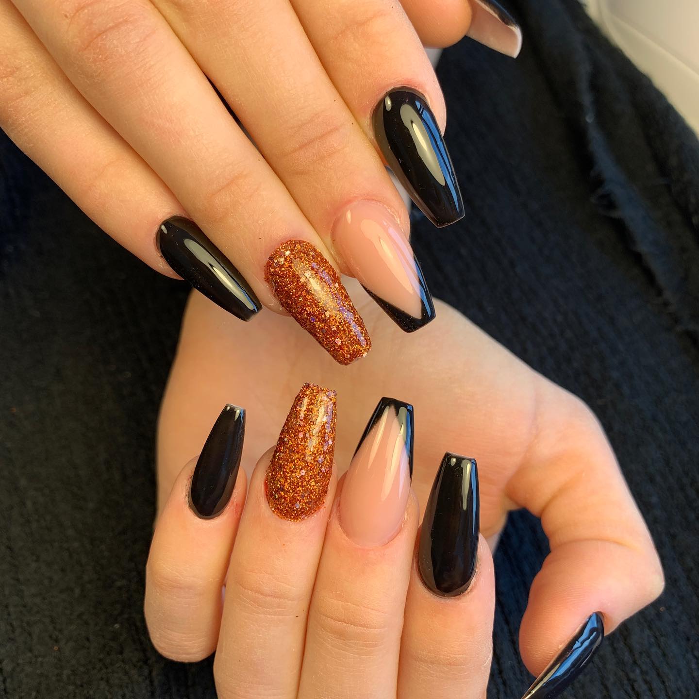 At first glance, the glossy jet-black nails exude a sense of mystery and sophistication. Their mirror-like shine reflects light beautifully, making them feel as luxurious as a patent leather clutch. Balancing this deep hue is a pair of accent nails drenched in molten copper glitter, sparkling like autumn leaves kissed by sunlight. The multidimensional shimmer brings warmth and texture, adding a festive flair perfect for transitional seasons.Meanwhile, the nude-toned nails with sharp black French tips bring a modern twist to a timeless classic. The contrast between the sheer blush base and the crisp, angled black edge emphasizes the ballerina shape, elongating the fingers with an effortless grace. This minimalist yet bold design ties the entire look together, offering a touch of editorial sophistication.The combination of rich black, warm glitter, and subtle nude creates a mesmerizing interplay of drama and delicacy. The structured ballerina shape itself adds to the allure—its elegant tapering flatters every hand, making it a go-to for those who love a sleek, fashion-forward vibe. This nail set is versatile enough for a glamorous night out but also chic enough to complement your favorite fall wardrobe essentials.