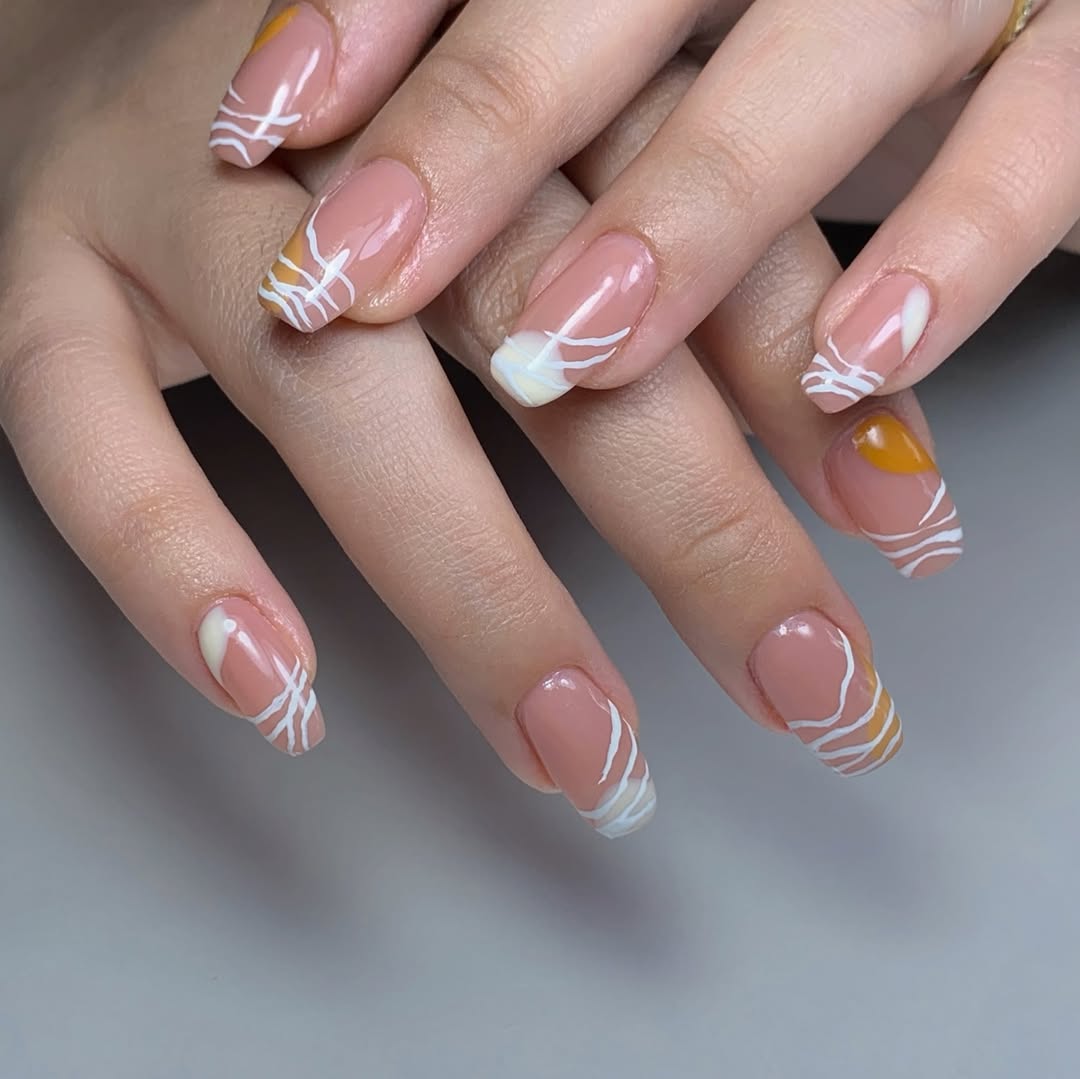 This nail look is the definition of chic simplicity with a modern twist. The manicure features a natural nude base enhanced with delicate white abstract nail lines that flow freely across the tips. The subtle addition of warm tones like mustard yellow and creamy white gives the design more depth and creativity while keeping the overall look soft and wearable.For anyone looking to experiment with abstract nail basic design, this is a perfect inspiration. The clean, minimal approach makes it versatile enough for daily wear, yet the artsy patterns elevate it into a true statement style. These simple abstract nails balance elegance and playfulness, making them suitable for both casual and professional settings.Abstract manicures like this one prove that you don’t need bold colors or heavy details to stand out. Instead, the beauty of abstract nail styling lies in its fluid lines and unexpected touches that add personality to every fingertip.