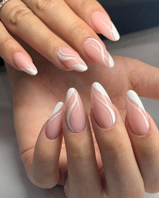 This manicure is the perfect mix of elegance and artistry, featuring stunning white abstract nails on an almond-shaped base. The soft nude background paired with flowing white swirls creates a look that is chic, modern, and timeless all at once. Unlike a classic French tip, this design gives a creative twist with curved abstract lines, making it more fashionable and unique.These white abstract nails are versatile enough to be worn anywhere—from weddings and parties to everyday wear. The design is clean and minimal yet striking, making it easy to pair with any outfit or accessory. The delicate swirls symbolize a modern take on minimalism, turning simple nails into an eye-catching masterpiece.