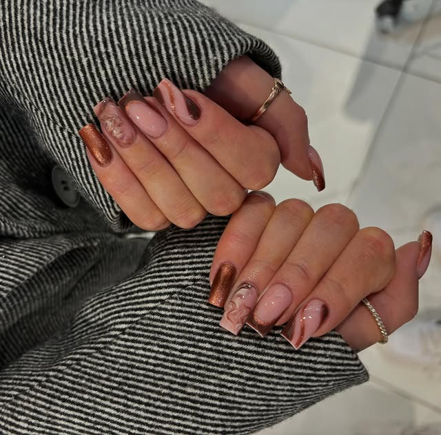One of the most timeless and stylish trends in manicures is marble swirl abstract nail art. This design mimics the natural beauty of marble stone with flowing patterns, soft curves, and blended shades that create a sophisticated finish. Whether done in earthy browns, metallic accents, or classic black and white, marble swirl nails add depth and elegance to your manicure. The abstract effect makes each nail look like a mini work of art, perfect for anyone who loves creative yet classy designs.