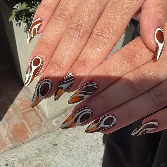- The intricate swirls and patterns showcase the creativity behind abstract nail art. Each nail looks like its own mini masterpiece, with a mix of sharp details and soft curves. The combination of earthy shades and bold contrasts makes it trendy yet timeless.Overall, this manicure highlights the uniqueness of abstract nail design. It’s expressive, stylish, and filled with personality—ideal for anyone who wants their nails to stand out as a true fashion accessory. With its retro-inspired tones and modern finish, this design is both daring and chic, making it one of the must-try nail looks of the season.