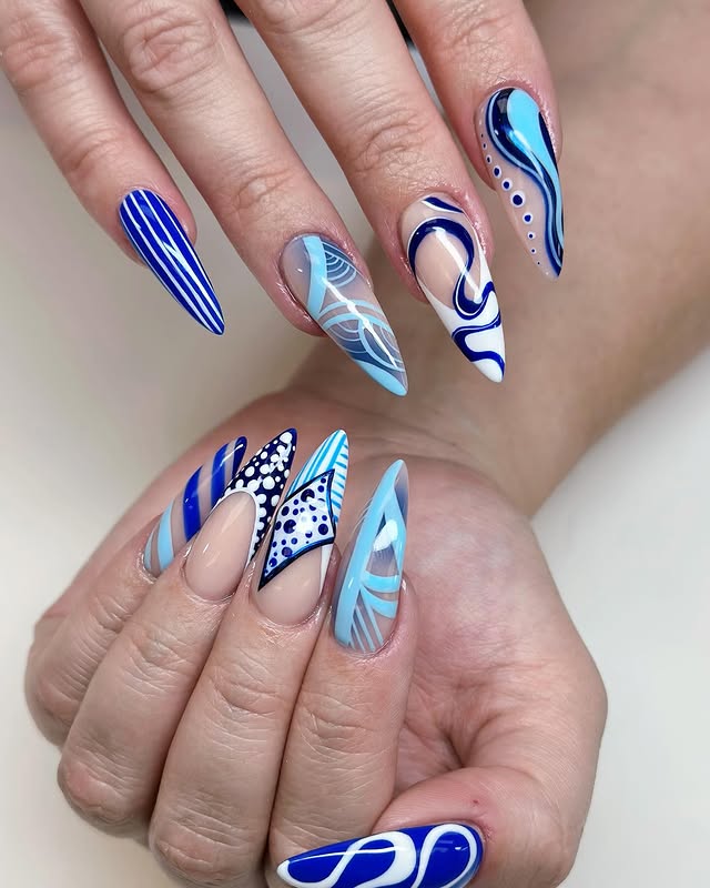 Bold, artistic, and full of personality—this manicure captures the true essence of aesthetic abstract nail styling. With a palette centered around shades of blue, the design plays with geometric patterns, flowing lines, and delicate details that feel both modern and expressive.Each nail showcases a different interpretation of abstract nail art, blending stripes, swirls, and polka dots into a cohesive masterpiece. The variation in patterns keeps the look interesting, while the cool tones of navy, sky, and pastel blue add balance and harmony. This is not just a manicure; it’s wearable art that tells a story with every fingertip.The beauty of this abstract nail design lies in its versatility. It can complement a sleek, minimal outfit by acting as the bold highlight, or pair seamlessly with equally artistic fashion choices. The pointed shape of the nails amplifies the dramatic effect, making the style perfect for those who want their manicure to double as a statement accessory.