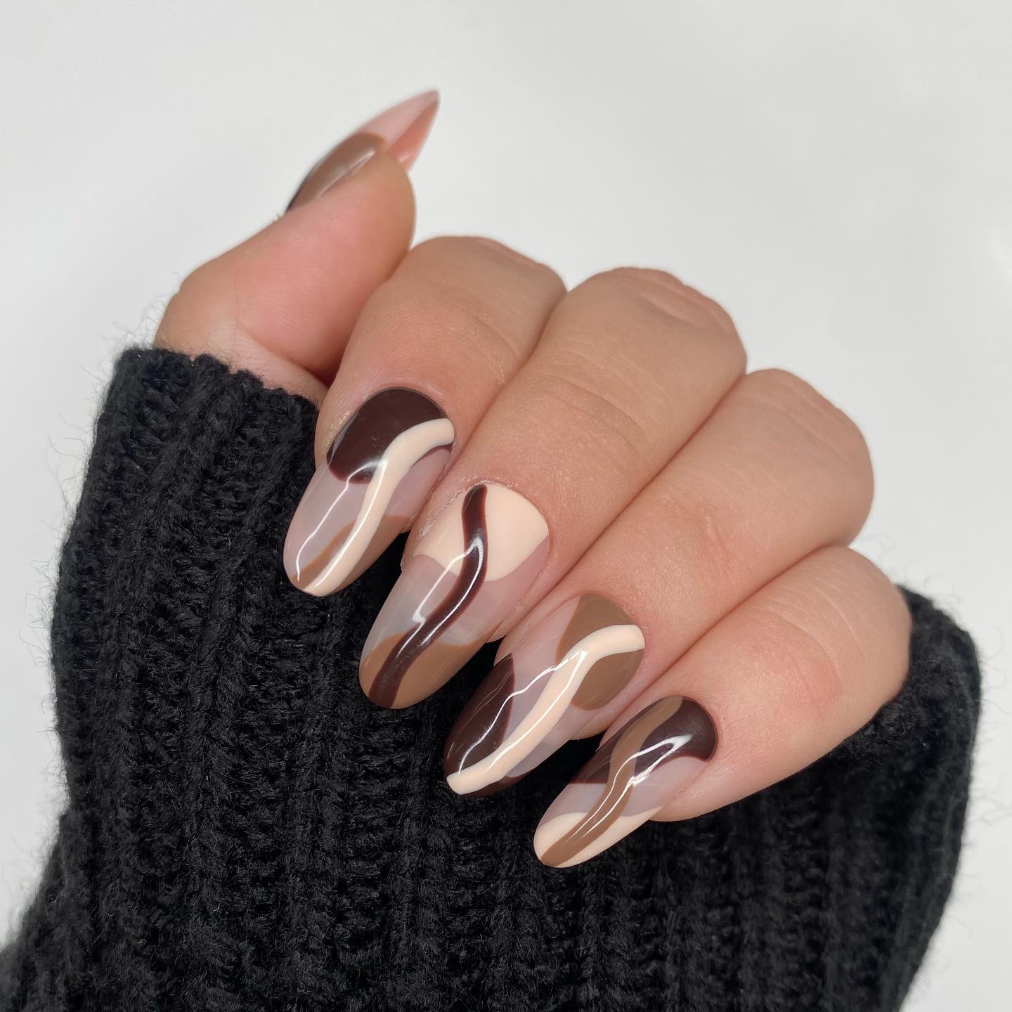 This style is a great example of how abstract nail trends are taking over the beauty world. Rather than sticking to classic patterns, the design incorporates fluid lines and bold color contrasts to create a unique look. The addition of soft curves and rich tones gives the nails a sophisticated edge.