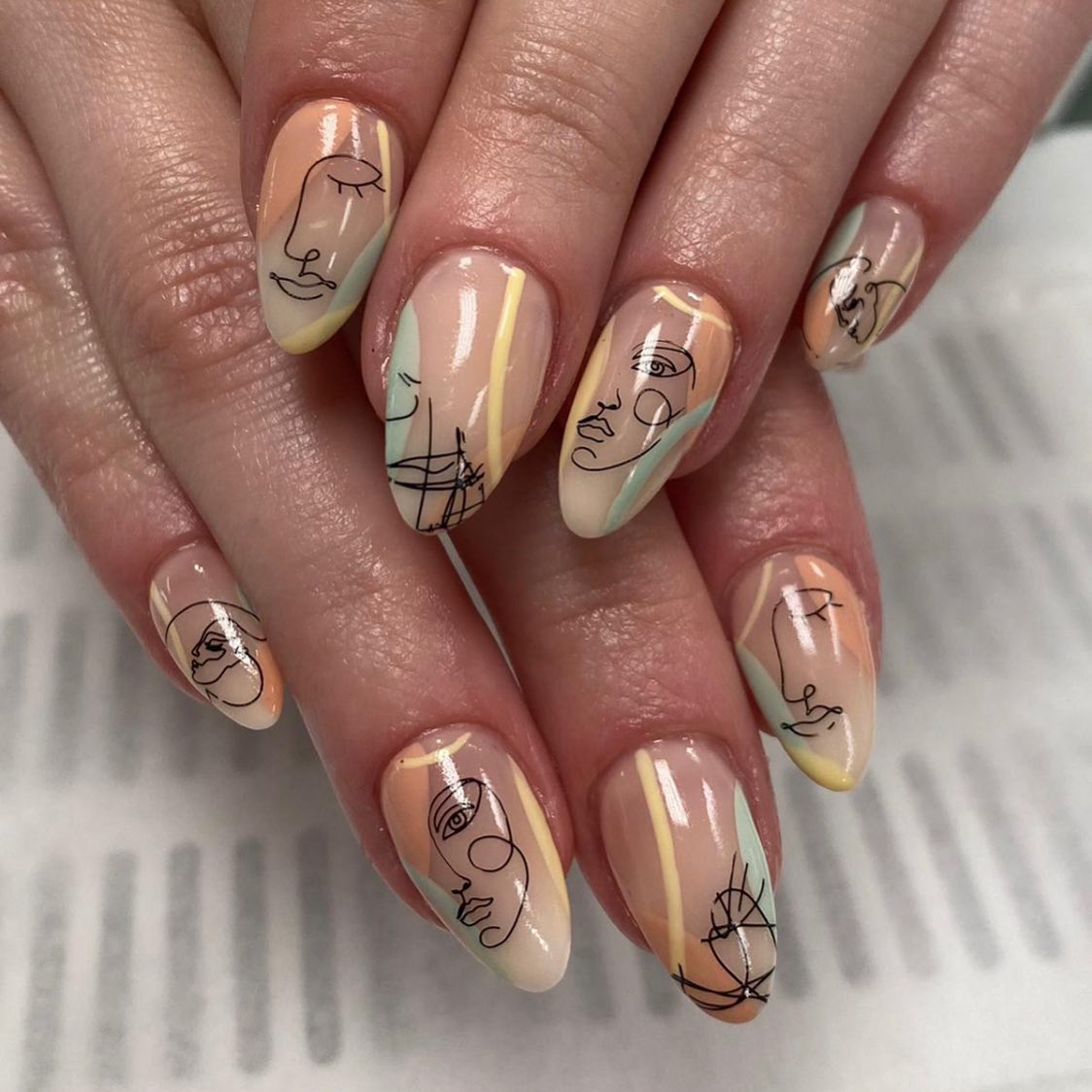 The image beautifully captures a bold and artistic manicure that immediately draws attention. These fun abstract nails combine creativity with elegance, making them a true statement piece for anyone who loves unique nail art. The almond shape elongates the fingers gracefully, while the design itself features a mix of pastel shades—soft peach, mint, cream, and beige—forming a dreamy background for the standout details.What sets these fun abstract nails apart is the intricate line art of faces sketched across each nail. This modern, artsy touch turns your manicure into wearable art, giving it a sophisticated yet playful vibe. The abstract lines feel both trendy and timeless, perfect for those who want their nails to express personality and creativity.