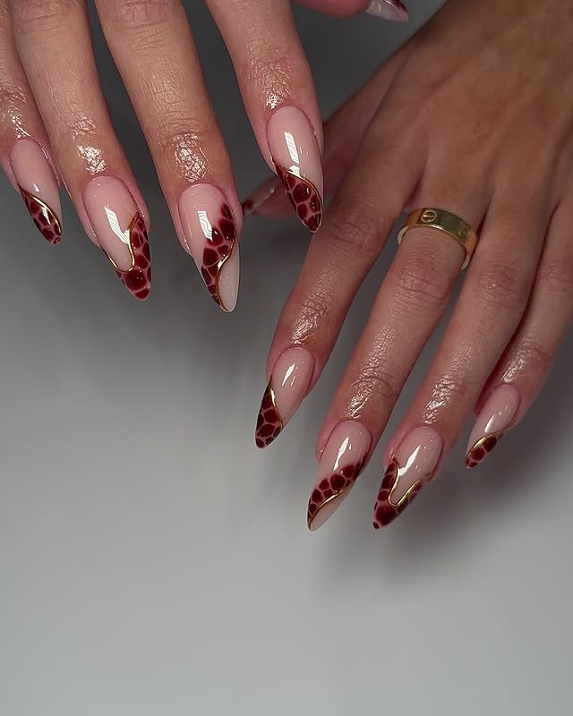 The deep tones are especially striking, making them perfect for anyone who loves burgundy abstract nails. The shade gives off a chic, fall-ready vibe but is versatile enough to wear year-round. Combined with the golden outline, it adds a touch of glam that elevates the overall finish.