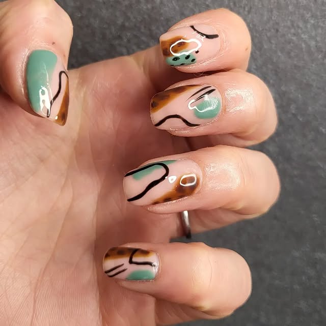 - This manicure is a great representation of an abstract nail style. Rather than sticking to straight lines or symmetrical patterns, the design embraces free-flowing shapes that create a truly artistic effect. It feels modern and effortlessly stylish, perfect for someone who wants their nails to stand out without being too overwhelming.For anyone who prefers simpler looks, these could also be seen as basic abstract nails. The beauty of this design is that it uses minimal color contrasts while still creating a bold statement. The combination of soft green, earthy tones, and nude makes it versatile enough for both casual and chic outfits.