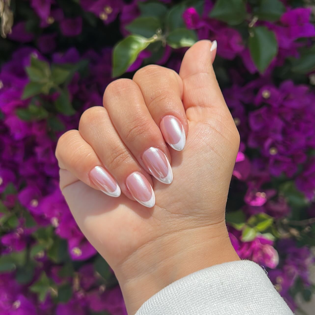 The second look takes the timeless French manicure and transforms it with a luminous chrome base. The subtle pink shine peeks through beneath crisp white tips, giving the nails a fresh and modern update. Set against a backdrop of blooming flowers, the nails feel vibrant and summery—like the perfect accessory to a sunny day. This design balances classic beauty with a touch of futuristic charm, making it both versatile and trend-forward. The chrome sheen adds depth, while the French tips keep it polished and sophisticated. It’s the perfect choice for someone who wants to stay chic while embracing the glow of summer.