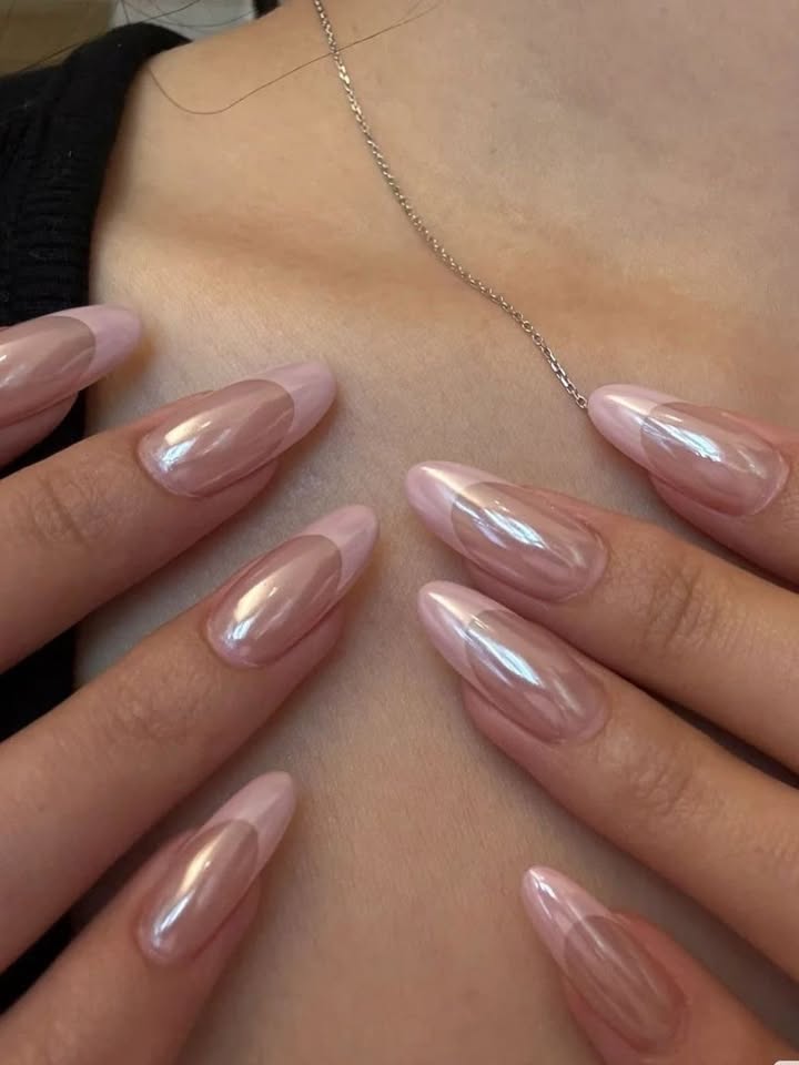Chrome nails have a way of turning simplicity into pure elegance, and this design is a perfect showcase. The long almond shape provides a graceful base, while the blush-pink tone shimmers with a delicate chrome glow that catches every angle of the light. The chic negative space at the cuticle adds a touch of modern artistry, making the manicure look effortlessly stylish and fashion-forward. With its mirror-like finish and soft reflective sheen, this design feels both minimalist and luxurious. These nails are the kind that speak volumes without being loud—a flawless choice for anyone who wants their hands to sparkle with sophistication and trend.