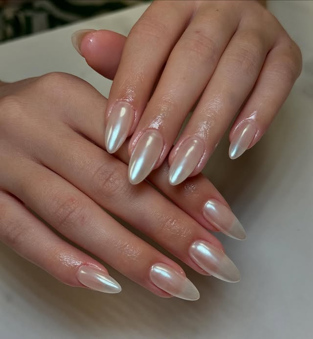 These chrome nails are the definition of modern luxury, catching light from every angle with a sleek, mirror-like finish. The almond shape elongates the fingers beautifully, while the pearly chrome sheen shifts with movement, giving a futuristic yet feminine glow. Their luminous, glassy effect feels almost liquid, making them both bold and elegant. The glossy top layer enhances the metallic shine, creating a flawless, high-fashion look that’s versatile for both day and night. These nails are more than a trend—they’re a statement, reflecting confidence, sophistication, and the subtle drama of summer glamour. Perfect for those who want their manicure to stand out effortlessly with minimal design yet maximum impact.